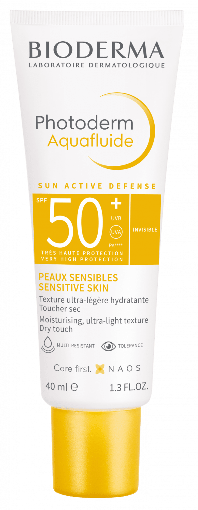 Photoderm Aquafluide SPF50+ je dnevna hidratantna i matirajuća krema za sunčanje koja jamči vrlo visoku UVA/UVB zaštitu. Njezina vrlo lagana, osvježavajuća i nevidljiva tekstura hidratizira i ostavlja suhi osjećaj na koži. Umjesto da preopterećuje kožu filterima, Sun Active Defense tehnologija unutar proizvoda jača sposobnost samoobrane kože kako bi se kompenzirali biološki utjecaji UVA zraka.