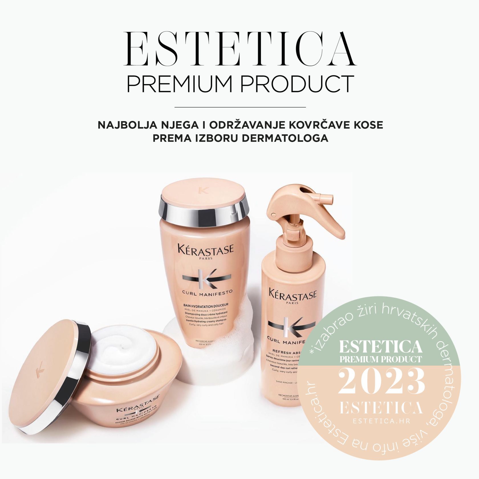 Budući da je tržište doslovno preplavljeno proizvodima za njegu svakog tipa kose, pa tako i kovrčave, savjeti dermatologa uvijek su nam dragocjeni i dobrodošli. U okviru natječaja Estetica Premium Product 2023, ugledne dermatologinje, članice žirija, u kategoriji Najbolja njega i održavanje kovrčave kose, proglasile su liniju Kérastase Curl Manifesto koja savršeno odgovara na sve potrebe kovrčave kose.