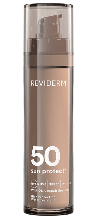 Reviderm Sun protect +SPF50 zaštita je od sunca četvrte generacije koja podržava vlastiti oporavak kože i sprječava oštećenje stanica od svjetlosti tijekom izlaganja suncu. Ova visoko-tehnološka zaštita od sunca sa svjetlosnom i infracrvenom zaštitom stanica pruža koži blistav ten, a inovativna formula obuhvaća višenamjensku zaštitu kao što su opekline od sunca, dehidracije, starenja kože i svjetlosnih oštećenja poput starosnih i pigmentnih mrlja.