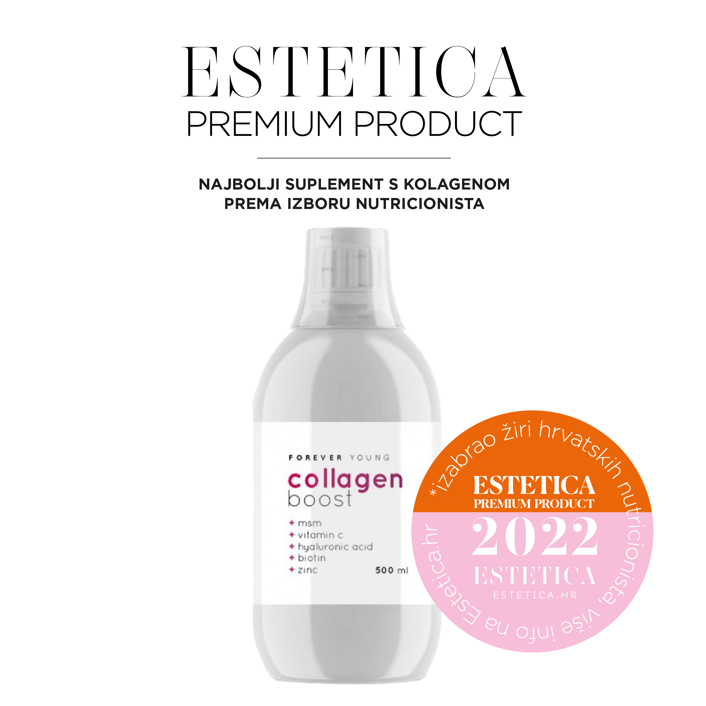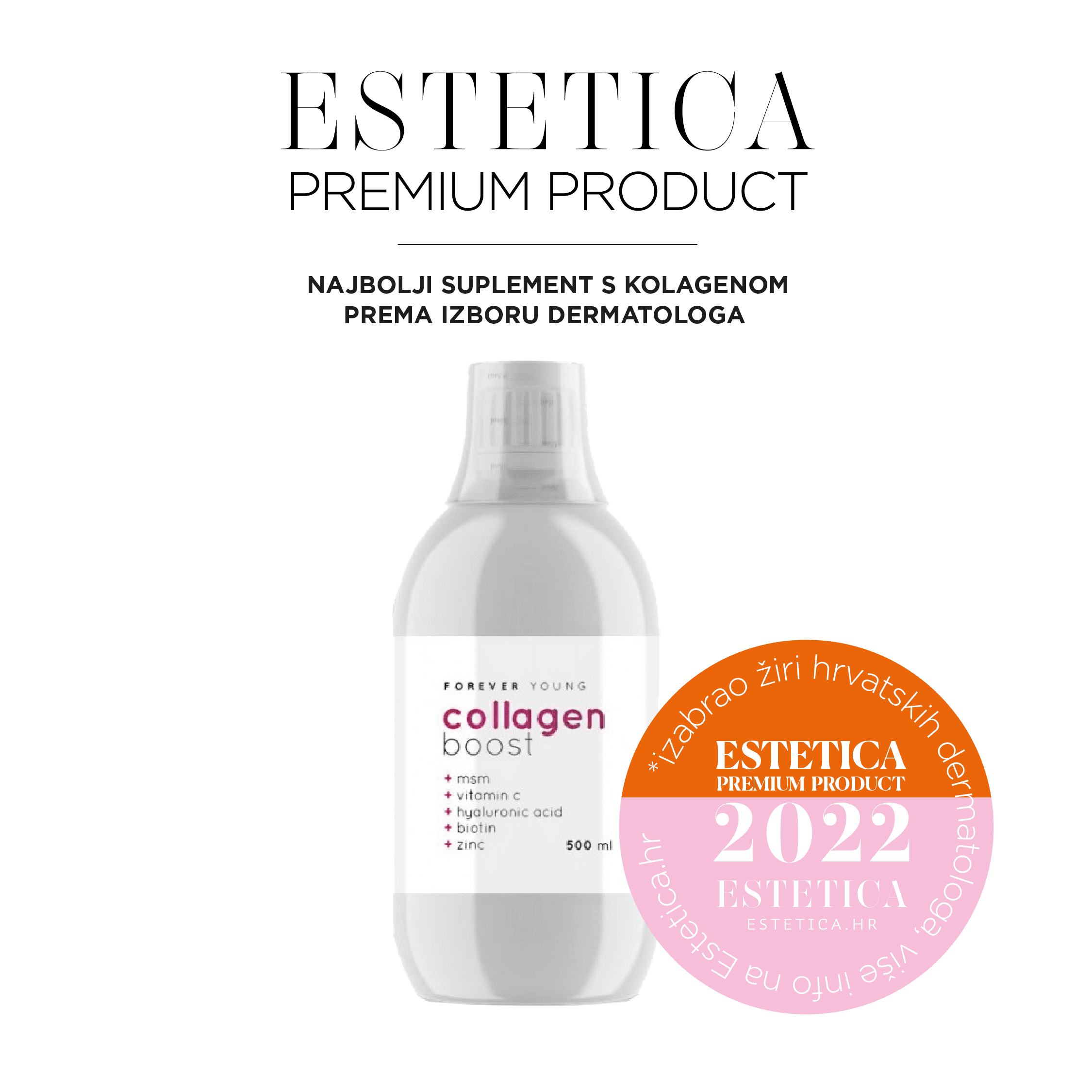 Forever Young Collagen boost dermatološki žiri proglasio je najboljim kolagenskim suplementom, i to nakon višemjesečnog testiranja, a mnogi od njih istaknuli su kako ih posebno raduje i činjenica da je ova napredna formula razvijena i proizvedena u Hrvatskoj, a iza nje stoje brojna istraživanja s timom stručnjaka te više od dvije godine testiranja.