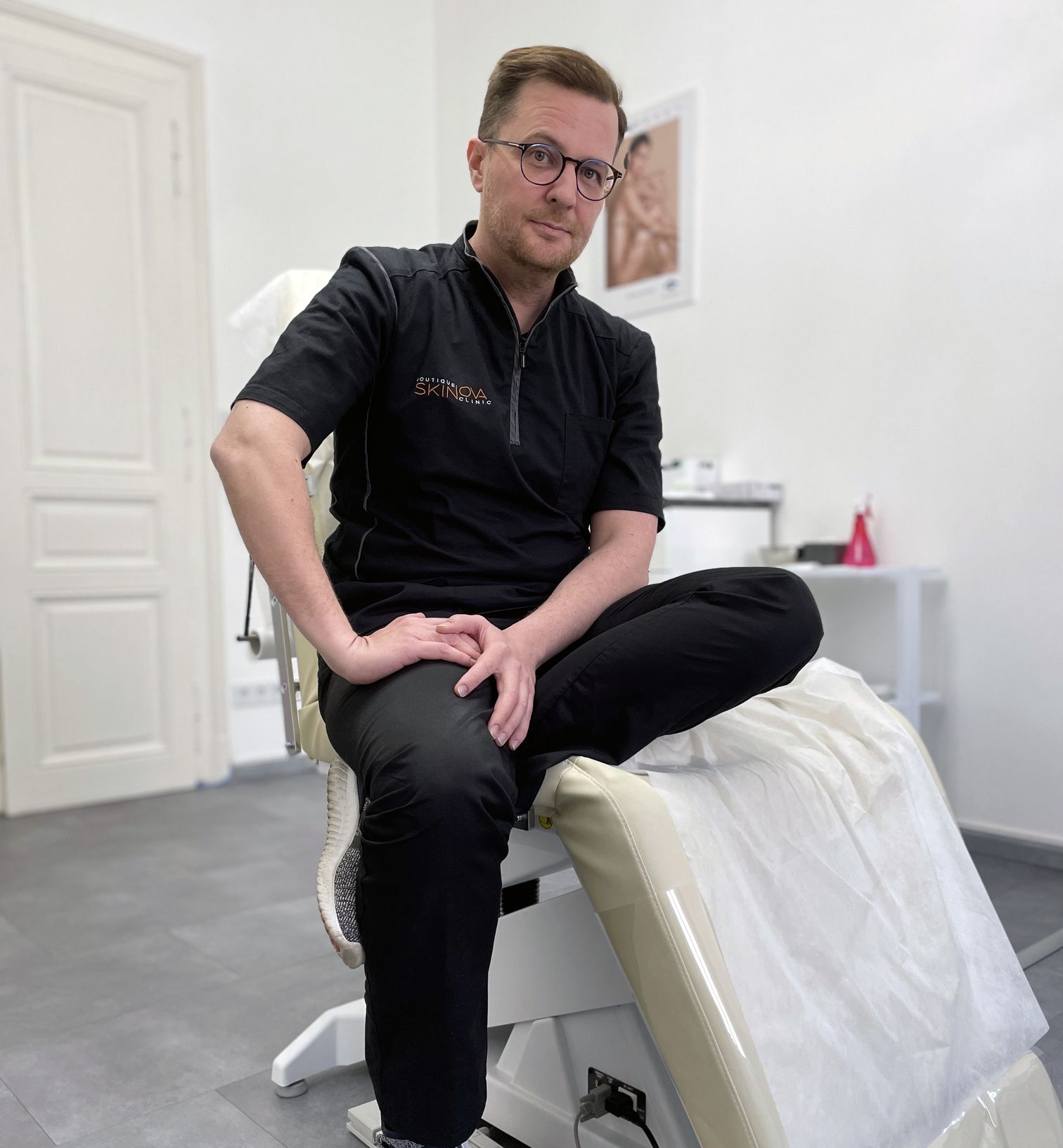 “Kao kirurg desetljeće sam živio sa zelenom bojom. No tijekom vremena, ta tradicionalna kirurška boja zamijenjena je svijetlo plavom ili pariški plavom koja je polako postala simbol kirurških struka. No, u Boutique Clinic Skinova omiljena boja radnih uniformi je crna – ukomponirana sa sivo narančastim detaljima koji s takvom bazom dolaze do izražaja”.