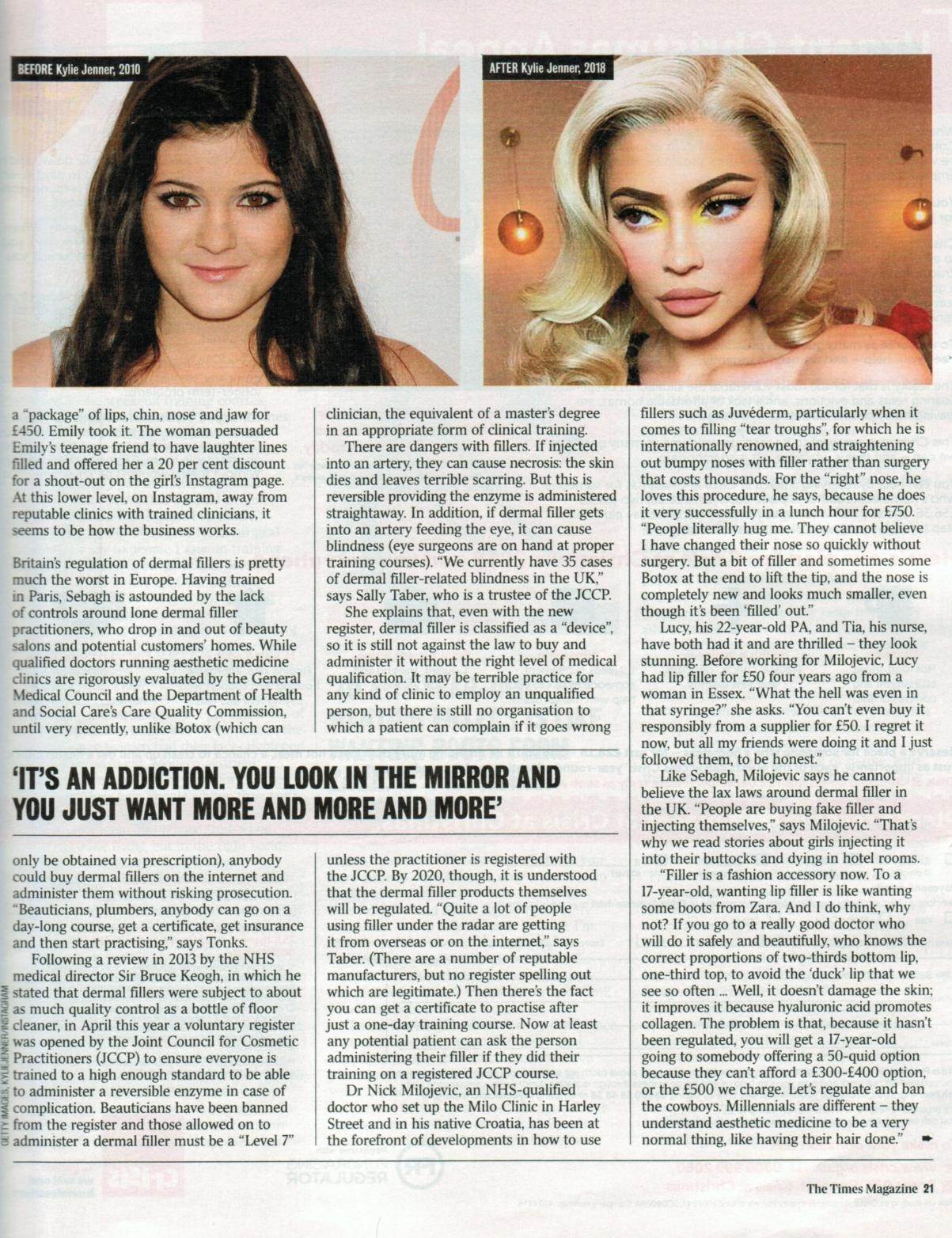 „Filere ova generacija doživljava kao modni dodatak pa nema razloga da si ne priušte kvalitetnu i sigurnu izvedbu koja će osigurati prekrasan rezultat. Ono što je opasno je nedovoljna zakonska regulacija koja omogućuje upotrebu prejeftinih i često sumnjivih filera. Nužno je zabraniti takve opcije kako bi se pacijente zaštitilo. Također, važno je održati prirodan i proporcionalan izgled svakog pacijenata, u suprotnom dolazi do podcjenjivanja estetske medicine zbog loše izvedenih intervencija.“ – izjavio je, između ostalog, dr. Nikola Milojević za britanski The Times.