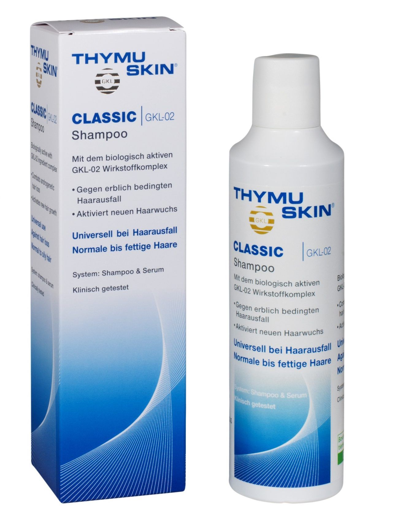 Thymuskin® je sustav međusobno usklađenih preparata za njegu kose i vlasišta koji zaustavljaju ispadanje kose te aktiviraju njen ponovni rast u slučaju da je folikul sačuvan i neoštećen. Jedinstvena kombinacija djelatnih tvari sadržanih u Thymuskinu® već se 25 godina uspješno koristi u liječenju gubitka kose različitog uzroka, a Thymuskin® Classic Šampon primjenjiv protiv svih vrsta i stadija gubitka kose. Odgovarat će normalnoj do masnoj kosi, kao i onoj pogođenoj peruti, a uz svakodnevnu primjenu pokazuje veliku učinkovitost čak i kod nasljednog gubitka kose.