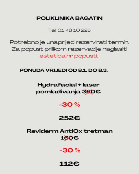 U Poliklinici Bagatin, u sklopu projekta Estetica My Moments, dostupan je popust od 30% na HydraFacial tretman s dodatkom lasera za pomlađivanje kože.