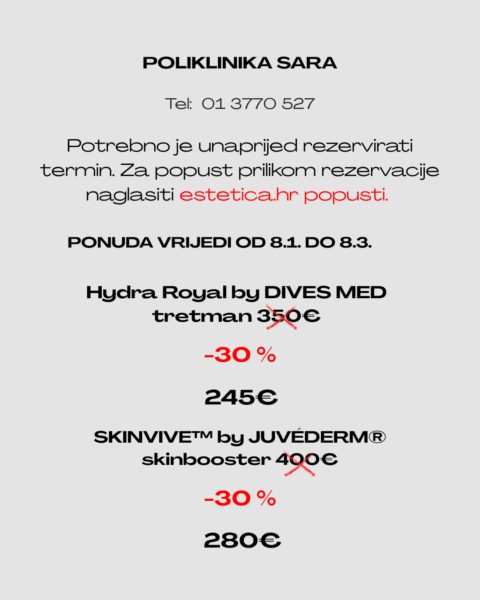 U sklopu projekta Estetica My Moments, Poliklinika Sara nudi vam sjajnih 30% popusta na Hydra Royal by DIVES MED tretman za vidno svježiju, sjajniju i puniju kožu već istog dana!