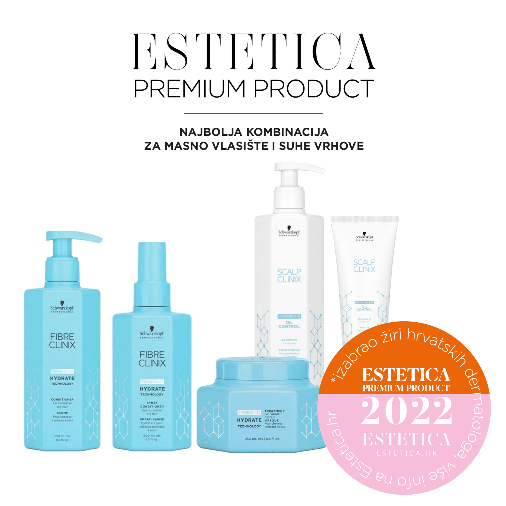 Kako bismo pronašli upravo takvu kombinaciju, ove smo godine u Estetica Premium Product powered by LUUN ® – Luxury Uniforms natječaj uključili kategoriju Najbolja kombinacija za masno vlasište i suhe vrhove, a nakon višemjesečnog testiranja, stručni dermatološki žiri odabrao je pobjedničku kombinaciju – Schwarzkopf Professional Scalp Clinix Oil Control i Professional Fibre Clinix Hydrate.