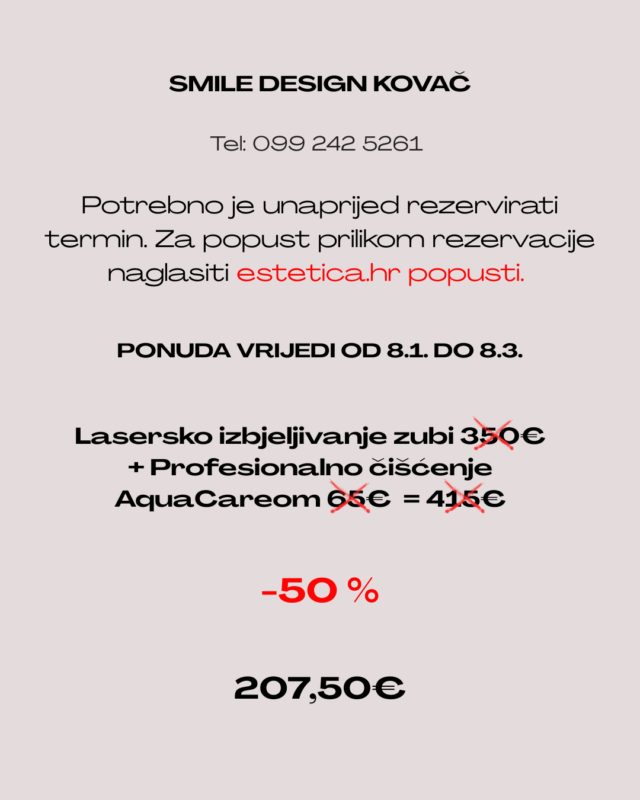 Ako se već neko vrijeme premišljate oko estetskih zahvata na zubima ili razmišljate o tome kako unaprijediti svoj osmijeh, pravo je vrijeme da iskoristite popust od čak 50 % na iznimno učinkovitu kombinaciju laserskog izbjeljivanja zubi i profesionalnog čišćenja AquaCare metodom u Ordinaciji dentalne medicine Smile Design Kovač.