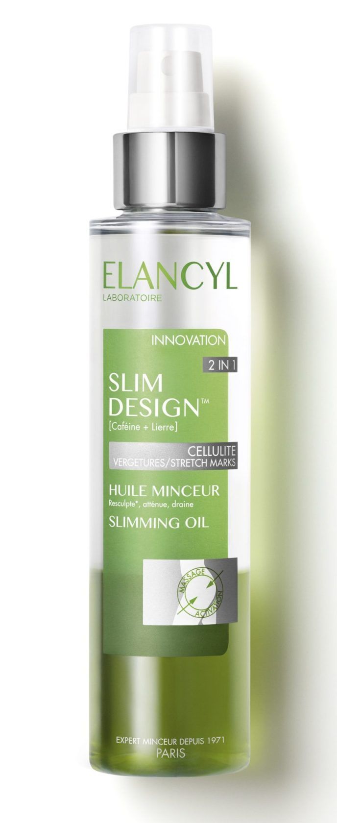 Karakterističnog imena Ulje za vitkost, Elancyl Slim Design 2u1 formula pospješit će učinak svake anticelulitne masaže. Sastoji se od dvije faze – prva, vodena faza s kofeinom i bršljanom odstranit će lipide iz potkožne regije, dok će druga, uljna faza omekšati kožu i potaknuti detoksikaciju uz pomoć anticelulitne masaže područja pogođenih celulitom. Ovo će ulje u samo nekoliko korištenja pomoći u razgradnji celulita, ali i umanjiti vidljivost strija i neravnina na koži.