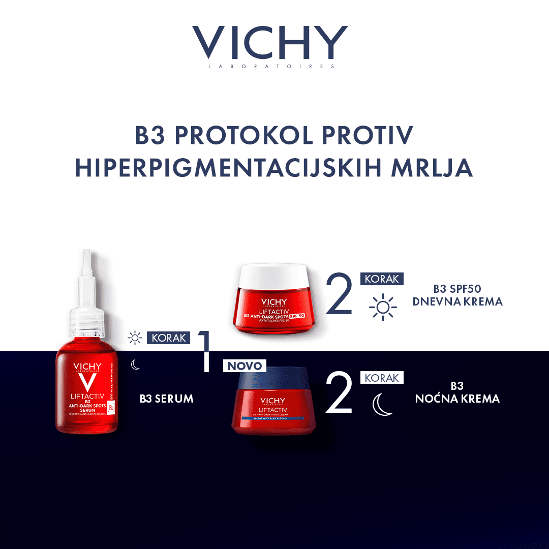 Vichy po prvi put koristi spomenutu kombinaciju niacinamida i čistog retinola, a Liftactiv B3 Anti-Dark Spots noćna krema dio je poznate Liftactiv B3 linije koja se bori protiv hiperpigmentacijskih mrlji i drugih nepravilnosti na koži.