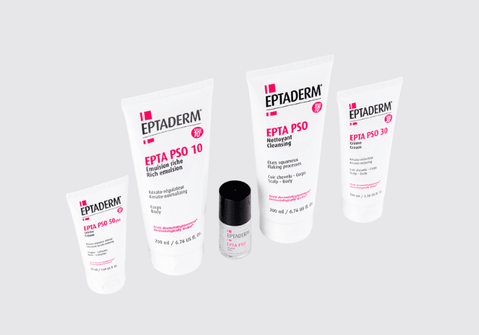 Eptadermova linija EPTA PSO sadrži proizvode za cijelo tijelo s inovativnim formulacijama koji sadrže od 10% do čak 50% ureje, aktivnog sastojka u borbi protiv suhe, ljuskave i zadebljane kože. Linija je pogodna za stopala, dlanove, laktove, koljena pa čak i nokte, a njena meka tekstura omogućava ugodnu i ciljanu primjenu na plakove i kaluse. Linija se sastoji od pet proizvoda: EPTA PSO 10 bogata emulzija, EPTA PSO 30 krema, EPTA PSO 50 PLUS krema, EPTA PSO gel za čišćenje i EPTA PSO nokti.