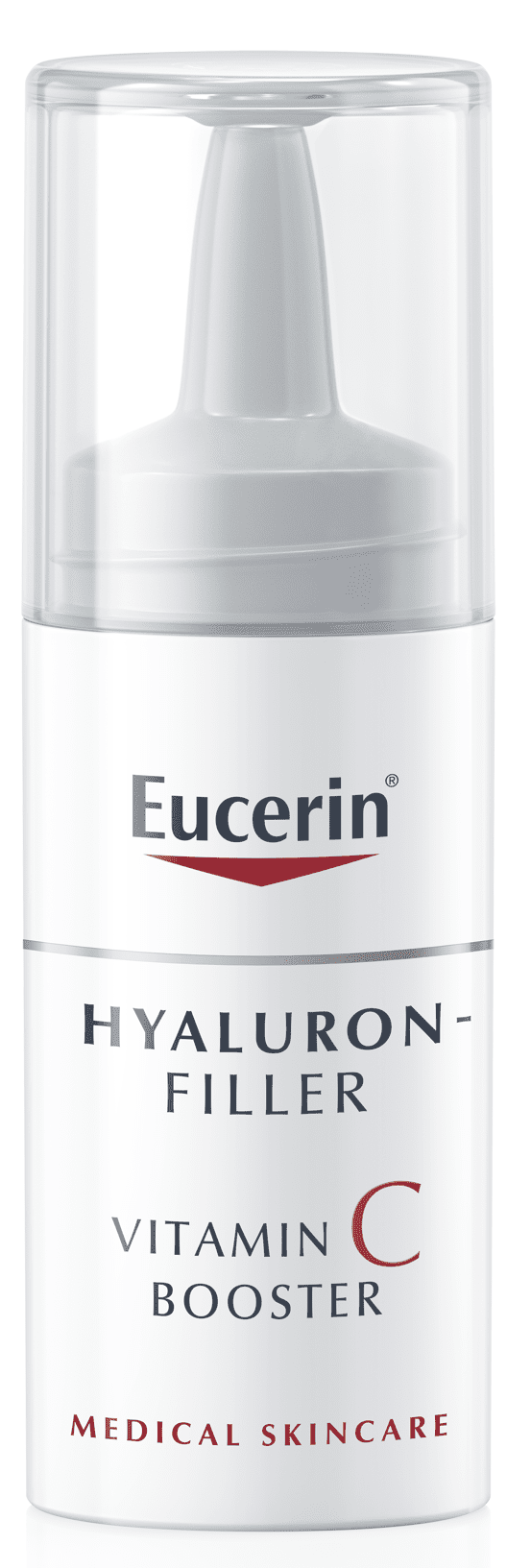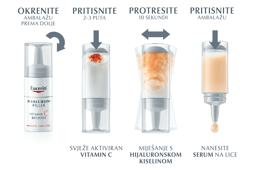 Da bi došlo do promjene u stanicama kože, istraživanja su pokazala kako preparat treba sadržavati najmanje 8 posto vitamina C. Formulacije s više od 20 posto nisu učinkovitije i mogu izazvati iritaciju. Eucerin® Hyaluron-Filler Booster sadrži 10 posto čistog vitamina C za postizanje rezultata uz dobru podnošljivost na koži.
