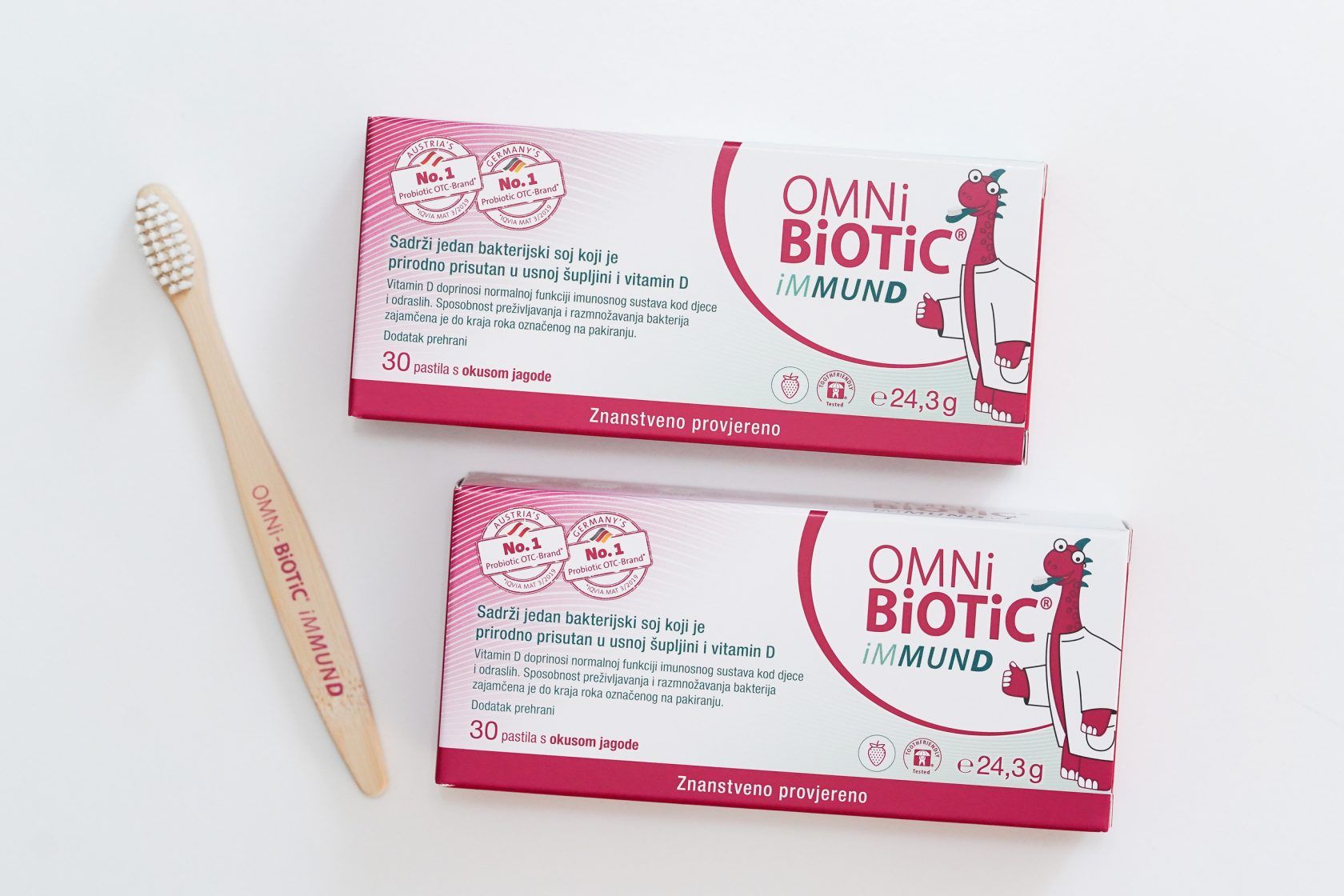 OMNi-BiOTiC® iMMUND u obliku pastila s okusom jagode primjeren je za odrasle i djecu od navršene 3. godine života. Ne sadrži šećer i uzima se nakon pranja zubi.