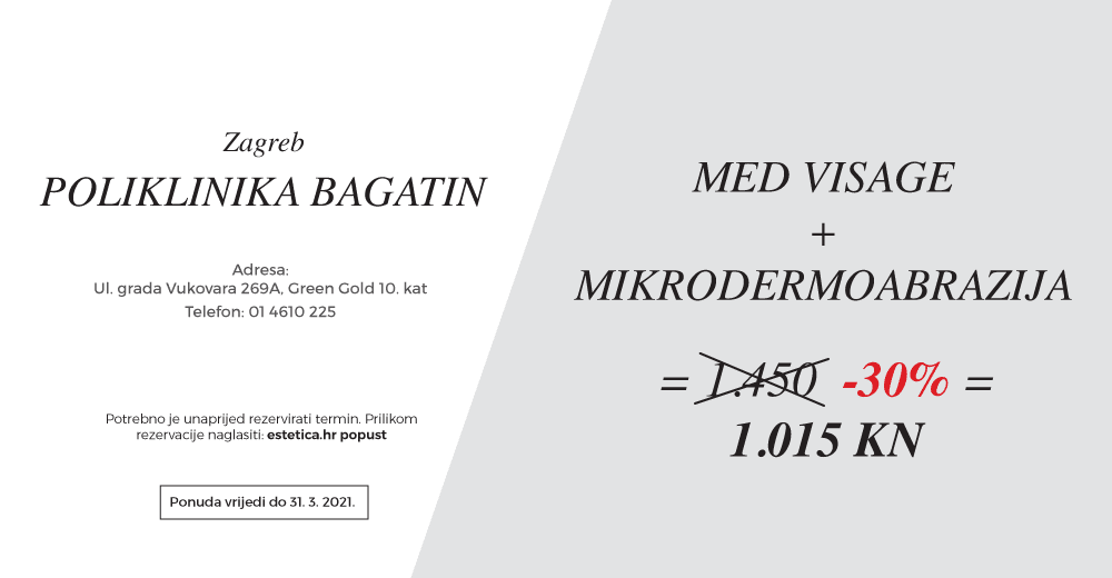 I najveća hrvatska poliklinika pripremila je za naše čitateljice pravu poslasticu – Poliklinika Bagatin vam omogućuje i na zagrebačkoj i na splitskoj adresi najbolje cijene za megapopularnu kombinaciju tretmana: Med Visage i mikrodermoabraziju.