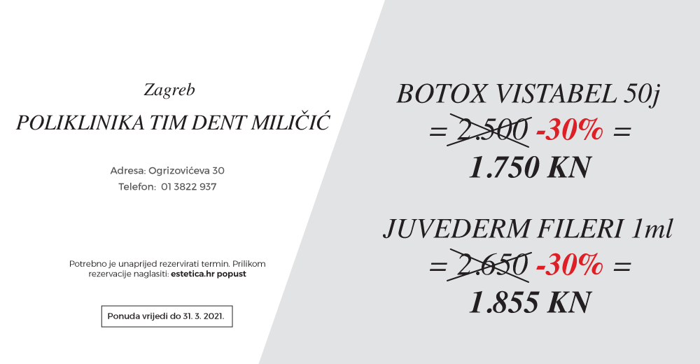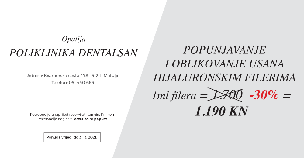 Zagrepčanke će izvrsnim cijenama filera uživati u Poliklinici TIM DENT Miličić, dok će dame iz Istre i Kvarnera izvrsne popuste iskoristiti u Klinici Dentalsan u Opatiji.