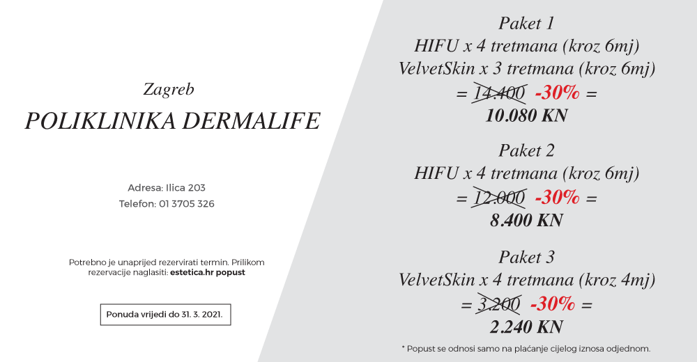 Dr. Nevia Delalle ovu je ponudu pripremila samo za vas, jer su – kako nam otkriva, ovo njeni najdraži neinvazivni tretmani. Uz 30% niže cijene, paket od 4 HIFU tretmana stajat će vas 8.400 kuna, paket od 4 VelvetSkin tretmana 2.240 kuna, dok ćete za paket koji uključuje 4 HIFU i 4 VelvetSkin tretmana izdvojiti 10.800 kuna. (Popust se odnosi samo na plaćanje cijelog iznosa odjednom).