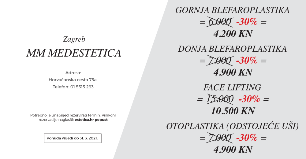 Za gornju ćete blefaroplastiku tako trebati izdvojiti samo 4.200 kuna, a za donju 4.900 kuna, dok će vas operacija odstojećih ušiju s popustom stajati svega 4.900 kuna.