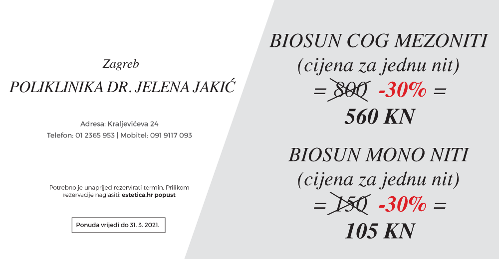 Ugledna zagrebačka dermatologinja dr. Jelena Jakić čitateljicama Estetice omogućuje da u njenoj Poliklinici dr. Jelena Jakić do kraja ožujka naprave nekirurško zatezanje lica Biosun Cog mezonitima po nevjerojatnoj cijeni od 560 kuna po niti te 105 kuna po Biosun Mono niti.