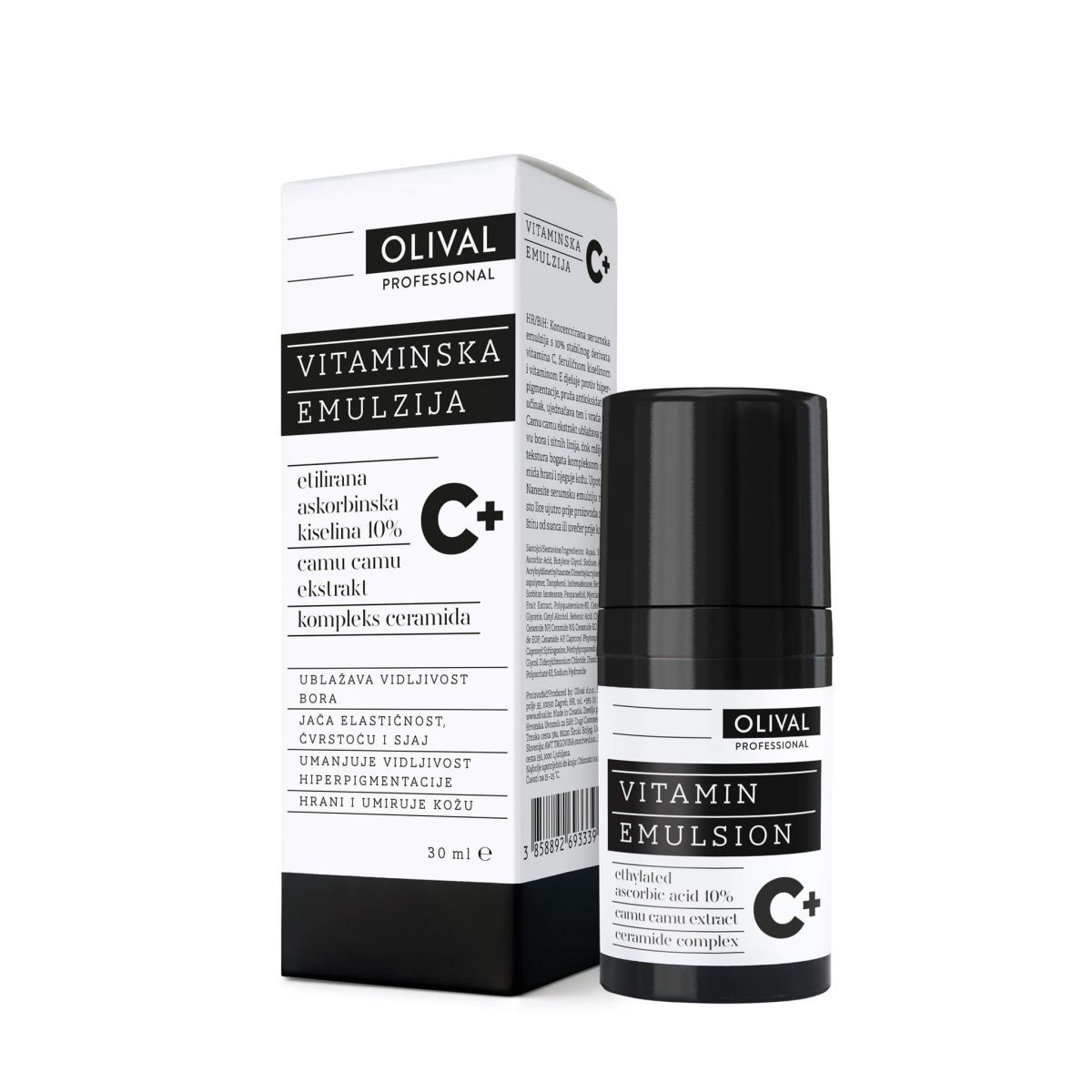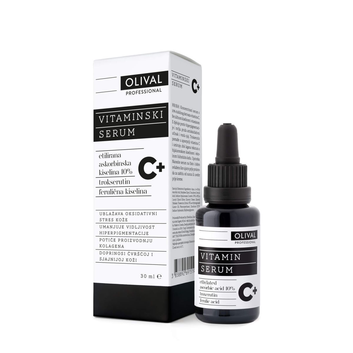 Olival Professional Vitaminski serum C+ uz moćan trio etilirane askorbinske kiseline, ferulične kiseline i vitamina E, sadrži i trokserutin koji pojačava apsorpciju vitamina C, potiče obnavljanje kože i ublažava crvenilo. Tu je zatim i ektoin, vrlo zanimljiv sastojak otkriven istraživanjem sposobnosti pustinjskog kaktusa da živi i raste u uvjetima potpune suše. Ektoin je tu da uravnoteži zalihe hidratacije, a hijaluronska kiselina da tu prijeko potrebnu vlažnost inicijalno „uvede“ u kožu. Vitaminska emulzija C+ uz magični trio sastojaka sadrži i camu camu ekstrakt kao dodatni bioraspoloživ izvor vitamina C, ali i drugih minerala, šećera, amino kiselina i voćnih kiselina. Svojim učinkom pozitivno utječe na čvrstoću, elastičnost, tonus i luminoznost. Formulaciju zaokružuje kompleks ceramida koji su slični prirodnim svojstvima kože i potpomažu samoregulaciji vlažnosti i otpornosti.