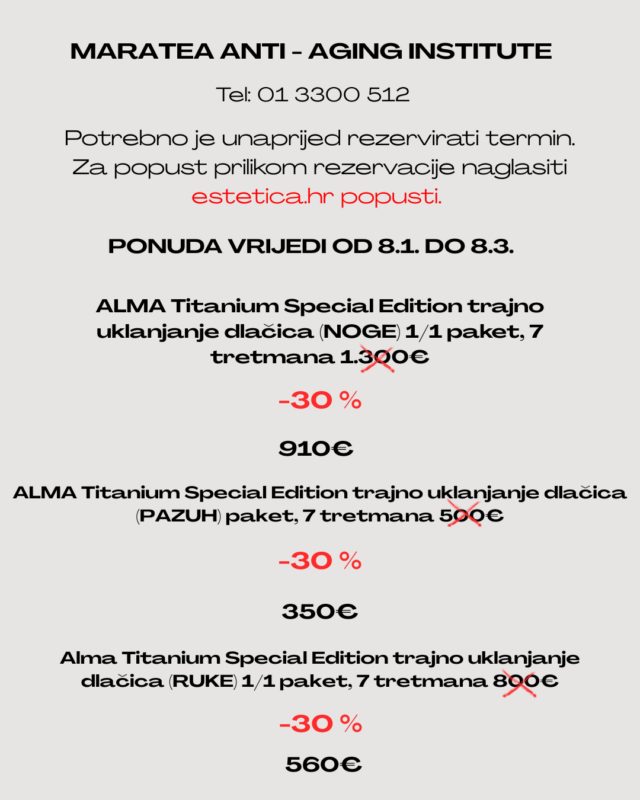 Maratea Anti – Aging Institute nudi 30 % popusta na Alma Titanium Special Edition tretmane trajnog uklanjanja dlačica u sklopu projekta My Moments. Popust vrijedi za sve pakete trajnih uklanjanja dlačica bilo kojeg dijela tijela.