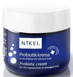 Nikel Probiotik krema za obnavljanje vrlo oštećene kože sadrži mliječni protein koji minimalizira reakcije uzrokovane iritacijom kože, smanjuje vrijeme trajanja upala i ubrzava oporavak fiziološkog stanja kože. Djeluje umirujuće i obnavljajuće na oštećenu kožu, crvenilo i ljuskanje, seboreični dermatitis, a pomaže i u terapiji psorijaze. Ne sadrži kortikosteroide, pa je prikladna i za djecu i za odrasle.