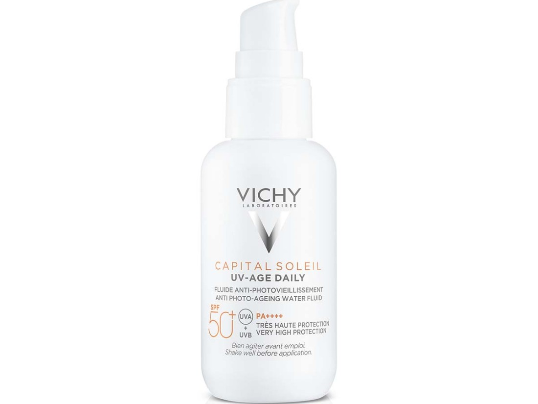 Vichy Capital Soleil UV-age Daily SPF50+ lagani je tonirani fluid na bazi vode koji pruža vrlo visoku zaštitu od UVA, UVB i vidljive svjetlosti te pomaže u sprečavanju znakova fotostarenja poput tamnih mrlja i gubitka čvrstoće. Formuliran je s tehnologijom NETLOCK te obogaćen peptidima, niacinamidom i vulkanskom vodom Vichy za jačanje kožne barijere.