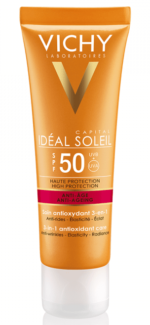 Vichy Ideal Soleil Krema za zaštitu od sunca s anti-age efektom SPF 50 obogaćena je ekstraktom fermentiranog crnog čaja za borbu protiv znakova starenja i poboljšanje sjaja kože. Sadrži i ekstrakt ploda biljke kamu kamu bogat vitaminom C za antioksidacijski učinak i zaštitu od vanjskih utjecaja, a kremasta dry-touch formula ostavlja prirodan mat efekt na koži.
