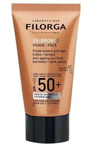 Filorga UV-Bronze Face Spf50+ Anti-Ageing Sun Fluid namijenjen je koži lica, a uz vrlo visoku UV i Infrared zaštitu, djeluje i na reduciranje znakova starenja i tamnih mrlja. Formula protiv bora, zahvaljujući sulforafanu, zaglađuje kožu prilikom svakog izlaganja suncu, a hiperpigmentacije postupno ujednačuje.